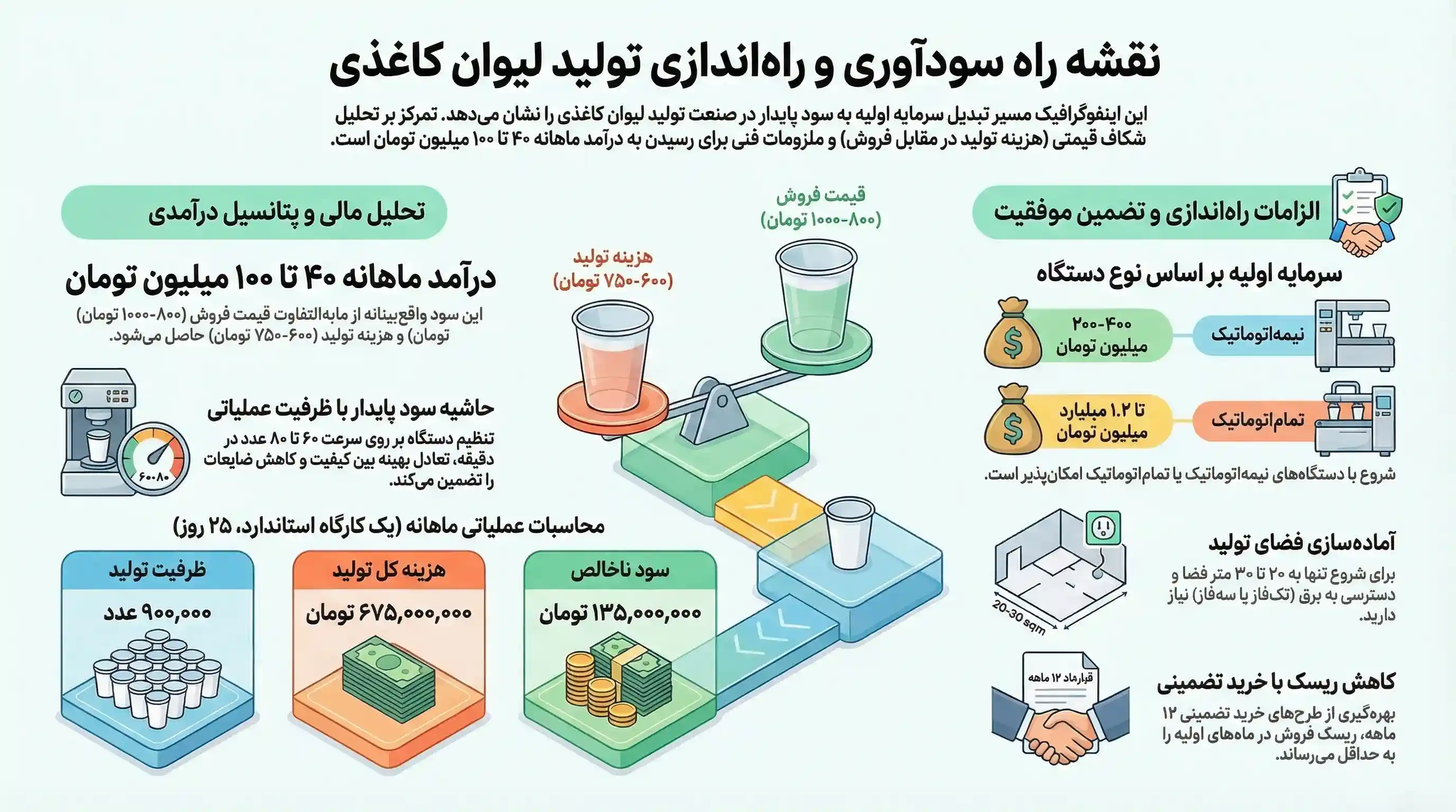 این جدول نشان میدهد رسیدن به درآمد در بازه ۴۰ تا ۱۰۰ میلیون تومان در ماههای اول کاملاً منطقی است. چرا؟ چون با هر نوسان کوچک در قیمت فروش عمده، کاهش ضایعات، و افزایش سرعت پایدار به ۷۰–۸۰ عدد در دقیقه، سود تولید بهراحتی بالاتر میرود. با مدیریت حرفهای این هزینهها، حاشیه سود لیوان کاغذی بهبود محسوسی پیدا میکند.