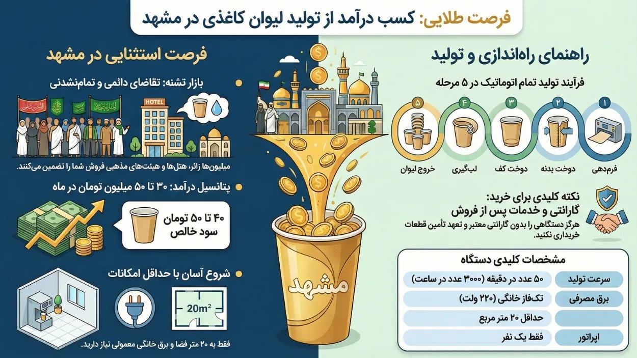 شاید بارها شنیده باشید که تولید دردسرهای زیادی دارد، اما داستان دستگاه تولید لیوان کاغذی در مشهد کمی متفاوت است. اینجا خبری از کورههای داغ، سروصدای وحشتناک صنعتی یا نیاز به سولههای چند هزار متری نیست. شما با یک دستگاه جمعوجور طرف هستید که در یک فضای ۲۰ متری، با برق خانگی کار میکند و محصولی تولید میکند که مشتریانش در مشهد، هرگز تمام نمیشوند. در این مقاله میخواهیم تمام زیر و بم این کار را بررسی کنیم تا ببینیم آیا درآمد ۳۰ تا ۵۰ میلیونی در ماه واقعیت دارد یا خیر.