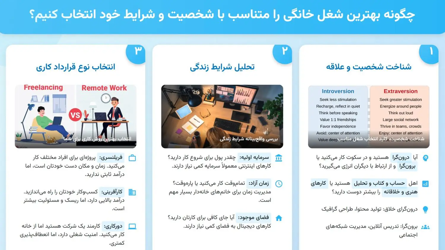 انتخاب یک شغل مناسب، مخصوصاً کاری که قرار است در خانه انجام شود، یک تصمیم مهم است. موفقیت شما فقط به پیدا کردن یک شغل پولساز بستگی ندارد، بلکه باید با شخصیت، سبک زندگی و امکانات شما هم جور باشد.