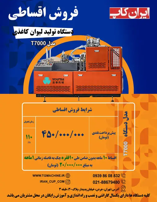با استفاده از دستگاه تولید لیوان کاغذی اقساطی، شما میتوانید به طور مداوم و با هزینه کمتری به تولید محصولات بپردازید. همچنین، با فروش اقساطی دستگاه تولید لیوان کاغذی، میتوانید هزینه را کنترل کنید و به راحتی به اهداف کسب و کار خود برسید.
