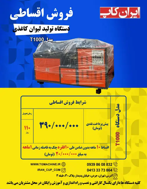 - معافیت های مالیاتی:در برخی موارد، ممکن است بتوانید از معافیت های مالیاتی برای خرید اقساطی دستگاه لیوان کاغذی بهره مند شوید. این امر می تواند به شما در کاهش هزینه های کلی خرید اقساطی دستگاه تولید لیوان کاغذی کمک کند