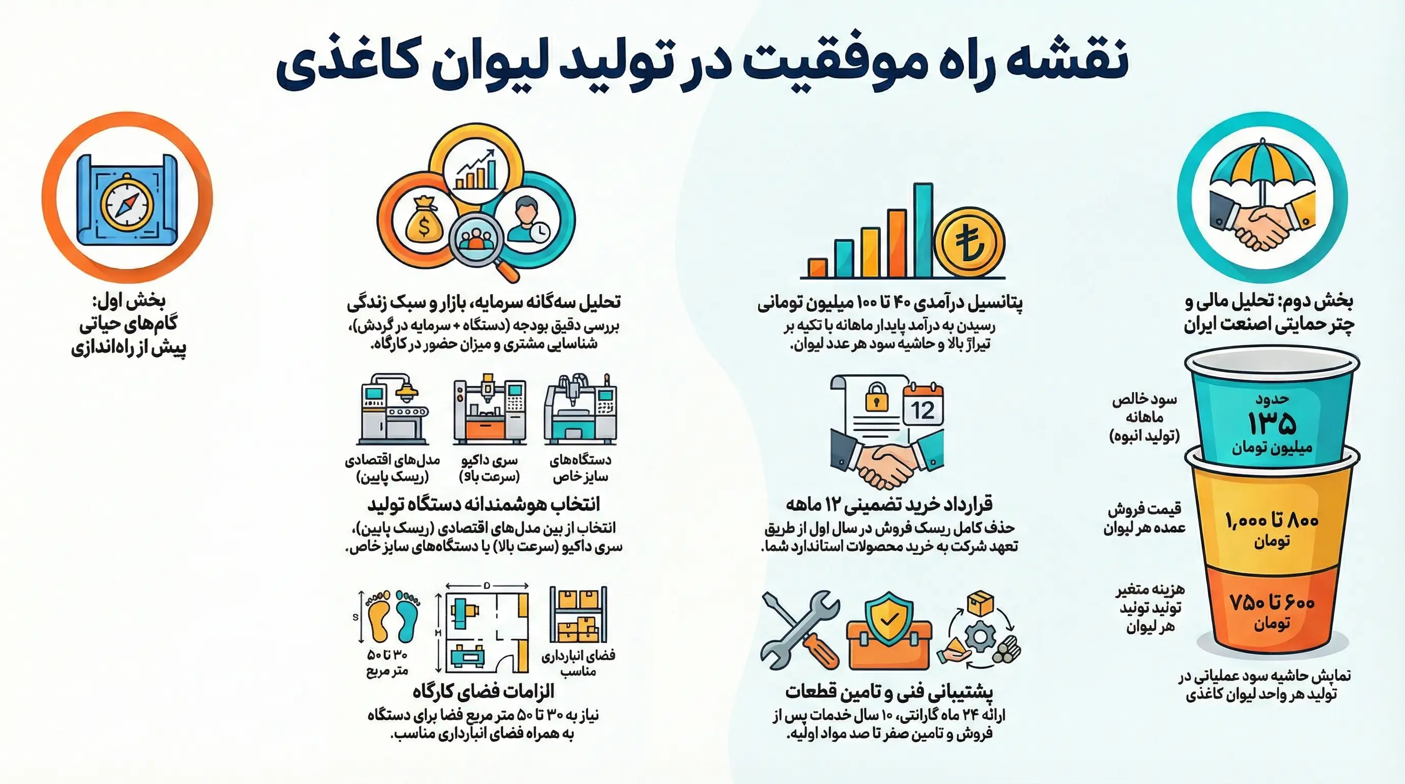 - سود تولید لیوان کاغذی در عمل چقدر است؟ سود این کار «تیراژ محور» است. حاشیه سود روی هر لیوان کم است (چند تومان)، اما وقتی روزانه دهها هزار لیوان تولید میکنید، این عدد بزرگ میشود.